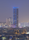 Figure emblématique et intemporelle, la tour est magnifiée dans sa verticalité par un voile de lumière à chaque étage tramant la façade et dessinant dans le panorama urbain un corps mouvant gracieux.