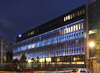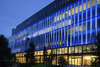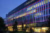 Dans le prolongement de sa charte graphique et du logo de l’entreprise (que nous avons aussi éclairé), des jeux lumineux oscillent en façade, calmement, voguant entre des teintes bleues et rouges.